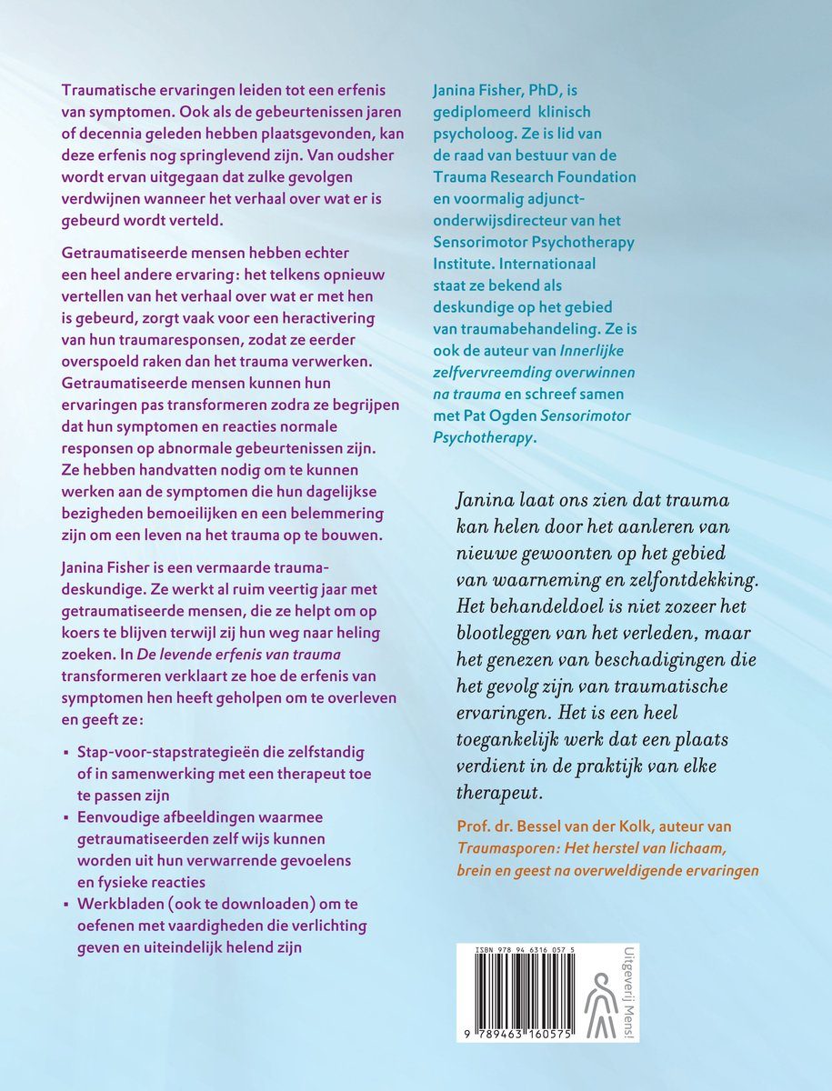 Janina Fisher is een vermaarde traumadeskundige. Ze werkt al ruim veertig jaar met getraumatiseerde mensen, die ze helpt om op koers te blijven terwijl zij hun weg naar heling zoeken. In ‘De levende erfenis van trauma transformeren’ verklaart ze hoe de erfenis van symptomen hen heeft geholpen om te overleven en geeft ze: